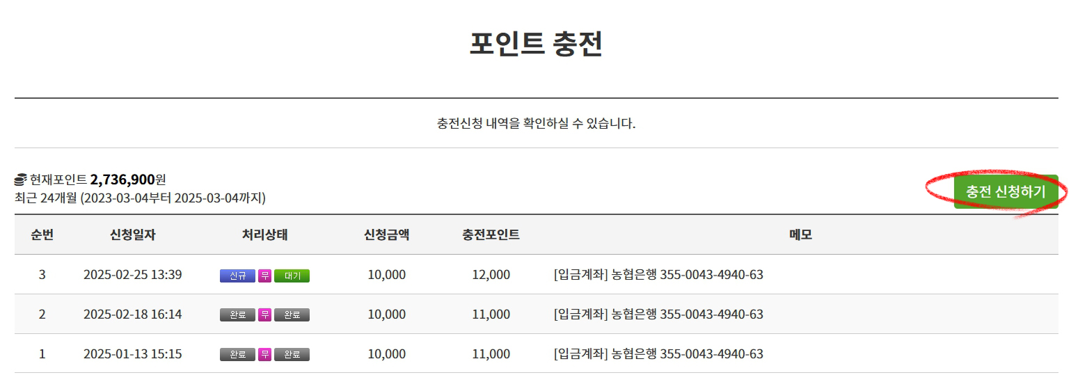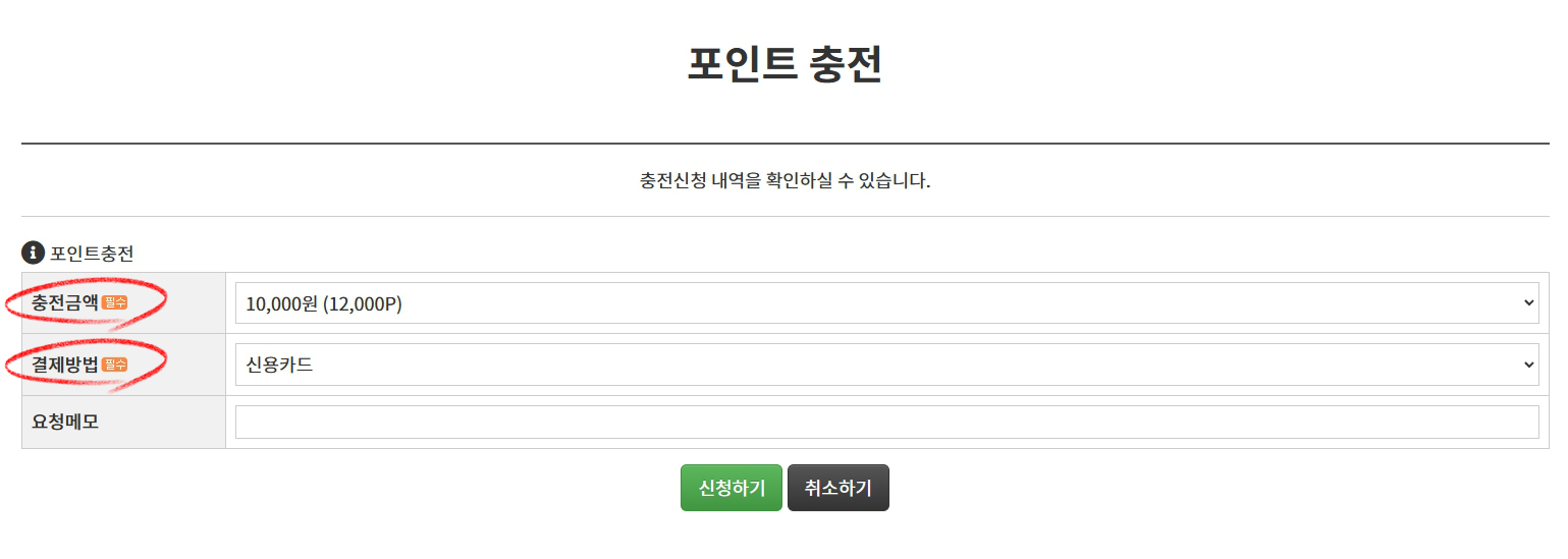 포인트 충전 페이지에서 충전 신청하기 버튼을 클릭해주세요.