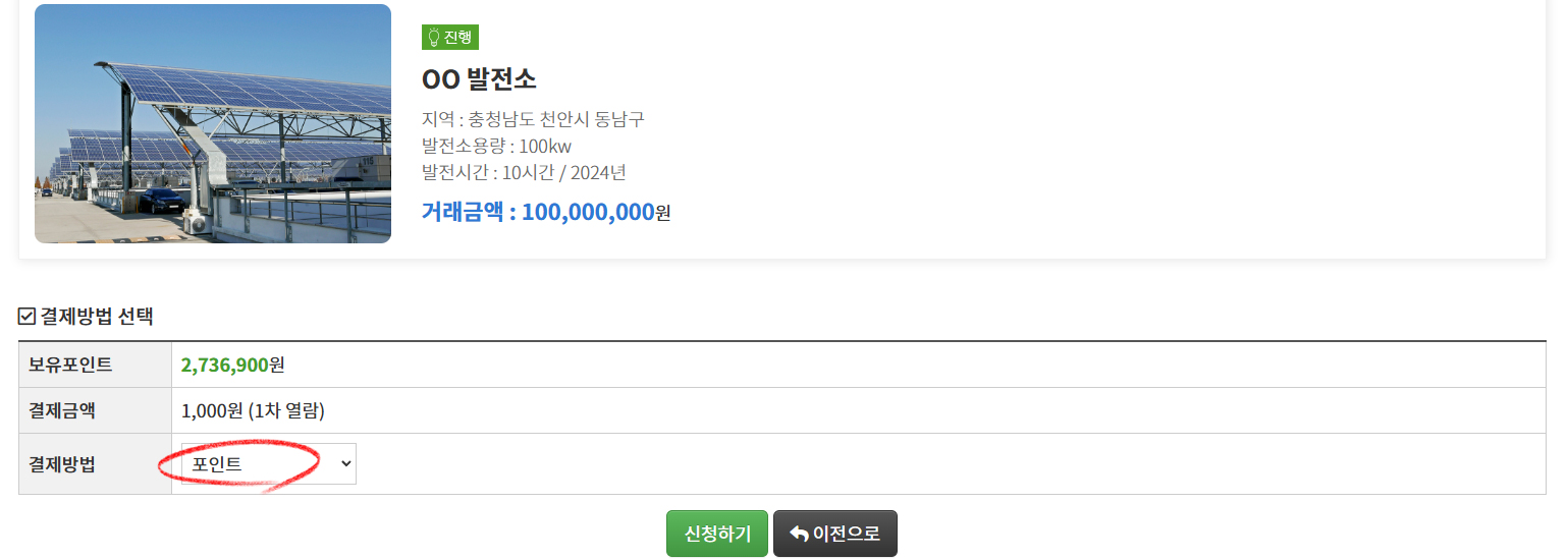발전소 용량 및 대행등록 여부를 확인해 계산된 등록 비용을 포인트로 결제해주시면 본사에서 신청내용을 확인한 후 등록이 완료됩니다.